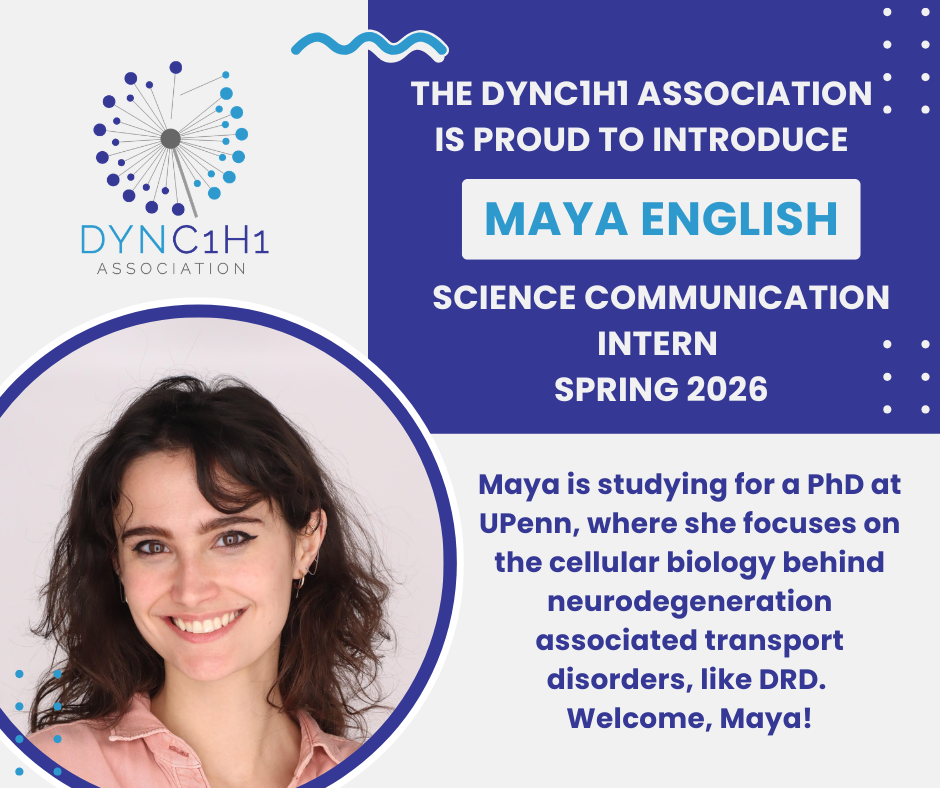 Image description: The DYNC1H1 Association is proud to introduce Maya English, Science Communication Spring 2026. Maya is studying for a PhD at UPenn, where she focuses on the cellular biology behind neurodegeneration associated transport disorders, like DRD. Welcome, Maya!